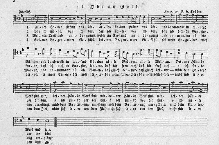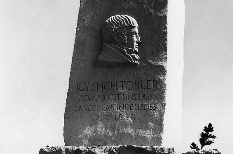 Es entbehrt nicht einer gewissen Ironie, dass Ausserrhodens Männer bis 1989, als sie dem Frauenstimmrecht nach mehreren Anläufen endlich ihren Segen erteilten, ein Landsgemeindelied anstimmten, dessen Text von einer deutschen Frau stammt. Die Dichterin Karoline Rudolphi veröffentlichte 1787 ein Gedichtbändchen, in dem sich die neunstrophige «Ode an Gott » befindet. Die in seinem Empfinden besten vier Strophen unterlegte Johann Heinrich Tobler mit jener höchst eingängigen Melodie, die ab 1877 als offizielles Ausserrhoder Landsgemeindelied gesungen wurde – von 1990 bis zur Abschaffung der Landsgemeinde 1997 nun auch von den Frauen. In Toblers Schaffen stellt die «Ode an Got t» mit dem textlichen Auftakt «Alles Leben strömt aus Dir…» das bedeutendste Werk dar. Darüber hinaus komponierte er eine grosse Zahl von Liedern, die teilweise noch immer zum Stammrepertoire von Chören gehören. Eine systematische musikalische Ausbildung hat Tobler nie genossen. Sein kompositorisches Naturtalent liess ihn Melodien erfinden und zu Papier bringen, die in ihrer Hörgefälligkeit bis auf den heutigen Tag anzusprechen vermögen. Ob seines musikalischen Bekanntheitsgrades geht leicht vergessen, dass sich der 1777 in Trogen geborene Johann Heinrich Tobler auch auf anderen Gebieten Verdienste erwarb. Er, der aus ärmlichen Verhältnissen stammte, erlernte den Beruf des Modellstechers und übte dieses Handwerk ab 1792 in Speicher aus. Von 1798 bis 1803, zur Zeit der Helvetik, hatte er das Sekretärsamt des Distriktgerichts Teufen inne. 1803 wurde er Ausserrhoder Landschreiber, ehe er 1816 zum Landsfähnrich und damit zum Regierungsmitglied gewählt wurde. Er blieb es allerdings nur ein Jahr lang. Seine Spuren in Speicher hat er einerseits mit der Gründung der Sonnengesellschaft, andererseits mit seiner massgeblichen Einflussnahme beim Bau der 1810 eingeweihten evangelischen Kirche hinterlassen. Zur Ausführung gelangte ein Bau nach Plänen von Johann Heinrich Tobler. Ab 1803 leitete er während 22 Jahren auch die Geschicke des Musikvereins Speicher, der damals als Instrumental-Gesellschaft zum Ochsen die Bevölkerung erfreute. Dem Andenken Toblers gilt das 1938 eingeweihte und von Bildhauer Wilhelm Meier geschaffene Denkmal auf der Vögelinsegg.