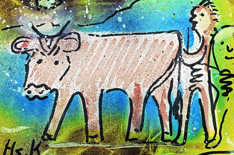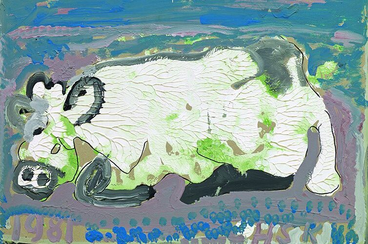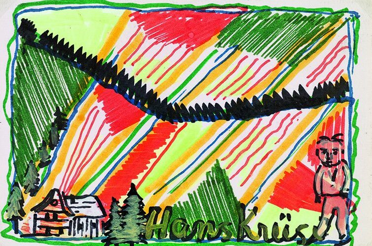 Es waren keineswegs die besten Umstände, die Hans Krüsis Start ins irdische Dasein kennzeichneten. Als uneheliches Kind der Emma Krüsi kam er im Alter von zwei Jahren in Speicher in die Obhut von Pflegeeltern, ehe man ihn als Zehnjährigen im Waisenhaus einquartierte. Der Schule mehr schlecht als recht «entronnen», schlug er sich da und dort in der Schweiz als Knecht und Gärtnergehilfe durch. 1947 liess sich Hans Krüsi schliesslich in St. Gallen nieder. Es kam die lange Jahre währende Zeit, in der er täglich frühmorgens mit der Bahn nach Zürich fuhr und an der Zürcher Bahnhofstrasse Blumen verkaufte. Seine mangelbehaftete körperliche Verfassung und die doch kritischen Lebensumstände nagten stark an seiner Gesundheit und nötigten ihn 1968 zu einem halbjährigen Kuraufenthalt auf dem Walenstadtberg. Wofür Hans Krüsi vor allem bekannt wurde, nahm seinen Anfang 1975: Er begann zu malen. Was alles als Farbträger dienen konnte – Packpapier, Servietten oder Karton –, nahm unter seinen Pinselstrichen andere Gestalt an. Tiere als Motiv hatten es ihm besonders angetan, und unter diesen wiederum Kühe – wohl eine «Reverenz» an seine Zeit als Knecht. Die Leute nahmen immer stärker zur Kenntnis, was Hans Krüsi da, völlig unverblendet und vielfach auch belächelt, an Phantasie in Bilder ganz eigener Prägung umsetzte. Er fand auch immer mehr Käufer seiner unkonventionellen Werke. So konnte es nicht ausbleiben, dass sich schliesslich auch der Kunsthandel seiner annahm. Ob alle, die sich ihm andienten, es auch in lauterer Absicht taten oder aber den Blick eigennützig mehr auf potenzielle Erfolgsaussichten richteten, die sie sich mit dieser Malerei versprachen, bleibe dahingestellt. Jedenfalls veränderte sich Hans Krüsis Existenz in wirtschaftlicher Hinsicht nachhaltig hin zum Positiven, so dass er nicht mehr auf den Verdienst aus dem Blumenverkauf angewiesen war. Seine Werke fanden den Weg in Galerien und Kunstausstellungen – die Kunstszene hatte ihn vollends entdeckt. Das fand seinen Niederschlag auch in Publikationen und in einem Film. Ein Lungenemphysem riss Hans Krüsi im September 1995 aus seinem bewegten Leben. Hinterlassen hat er ein umfangreiches Werk. Der Kanton Appenzell Ausserrhoden erwarb 2012 eine namhafte Sammlung seiner Bilder.